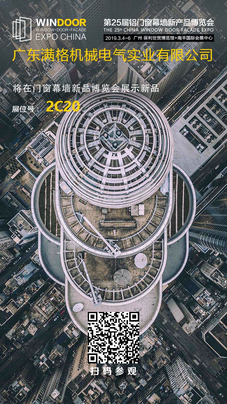 第25届全国铝门窗幕墙新产品博览会 展览日期:2019年3月4日-6日(三天) 展出时间:3月4日;09:30-17:00 3月5日- 6日;09:00-17:00 展览地点:广州;保利世贸博览馆;+;南丰国际会展中心 满格机械展位:2号馆;2C20