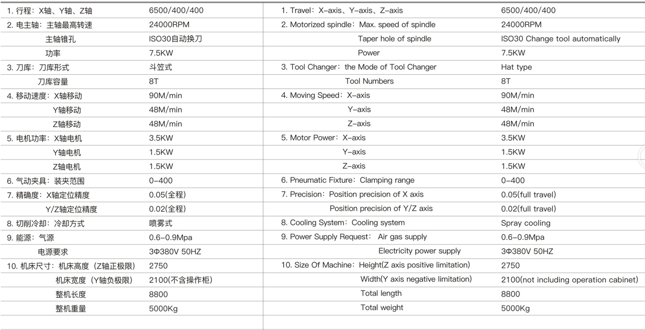 1.该设备是一台集铣削、钻孔、切割、倒角为一体的三轴龙门加工中心,适用于各种长度的铜、铝型材等金属加工。