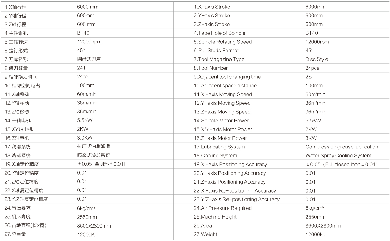 8.设备高速行驶性能良好:X轴最快速度可达90M/min,Y、Z轴可达48 M/min。