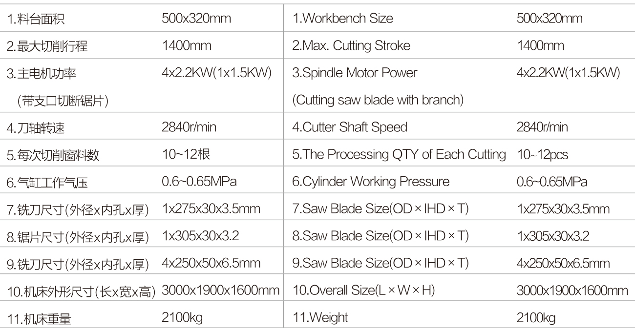 用六把硬质合金铣刀和锯片组成组合刀具,工作台移动,六把刀一次切削行程,在铝合 金窗料和幕墙上铣出正确的榫口。根据所需的榫口尺寸,铣刀可分别做上、下、前、后 和摆角调整,并增加垂直立式锯片做切口用。因而加工范围大,适用性广,生产率高。