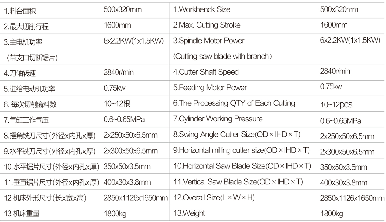 1,此机床为走刀式端面铣床,用六把硬质合金镶片铣刀和锯片组成组合刀具,一次切削行程,在铝合金窗料或幕墙料上铣出正确的榫口。