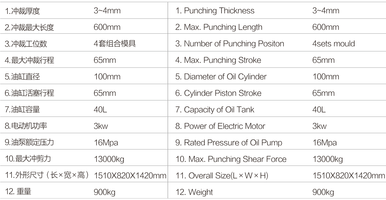 1,在该冲床的台面上安装各系列铝型材组合模,可完成各种相应推拉窗或平开窗铝合金型材全部孔和缺口的冲裁加工。