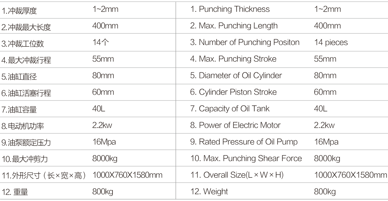 1,在该冲床的台面上安装各系列铝型材组合模,可完成各种相应推拉窗或平开窗铝合金型材全部孔和缺口的冲裁加工。